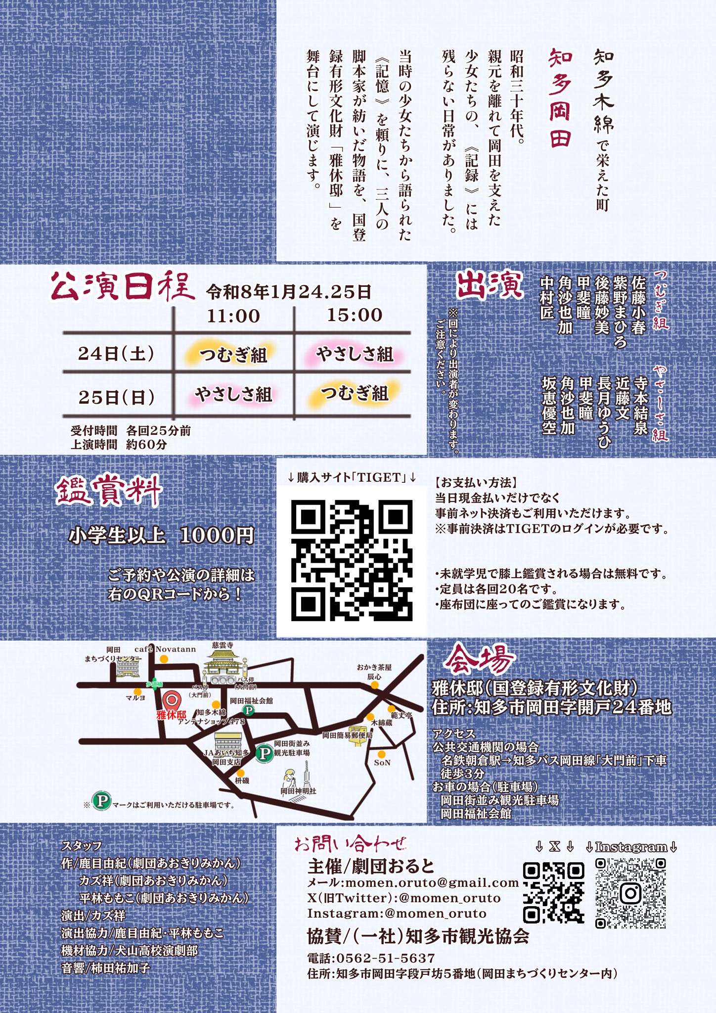 2026/01/06 カズ祥・脚本演出/鹿目由紀、平林ももこ・脚本-劇団おると『岡田ものがたり〜木綿がつむぐ、人のやさしさ〜』 カズ祥が脚本演出、鹿目由紀・平林ももこが脚本をつとめます、劇団おるとさんの『岡田ものがたり〜木綿がつむぐ、人のやさしさ〜』が、上演されます。 2026年1月24日(土)/25日(日) 11:00~/15:00~ (約60分) 雅休邸(愛知県知多市岡田)にて 知多木綿のまち ✕ 国登録有形文化財 ✕ 演劇 昭和のあの頃を感じる演劇体験を! ▼詳細・ご予約はこちらから 一覧に戻る 次のお知らせ