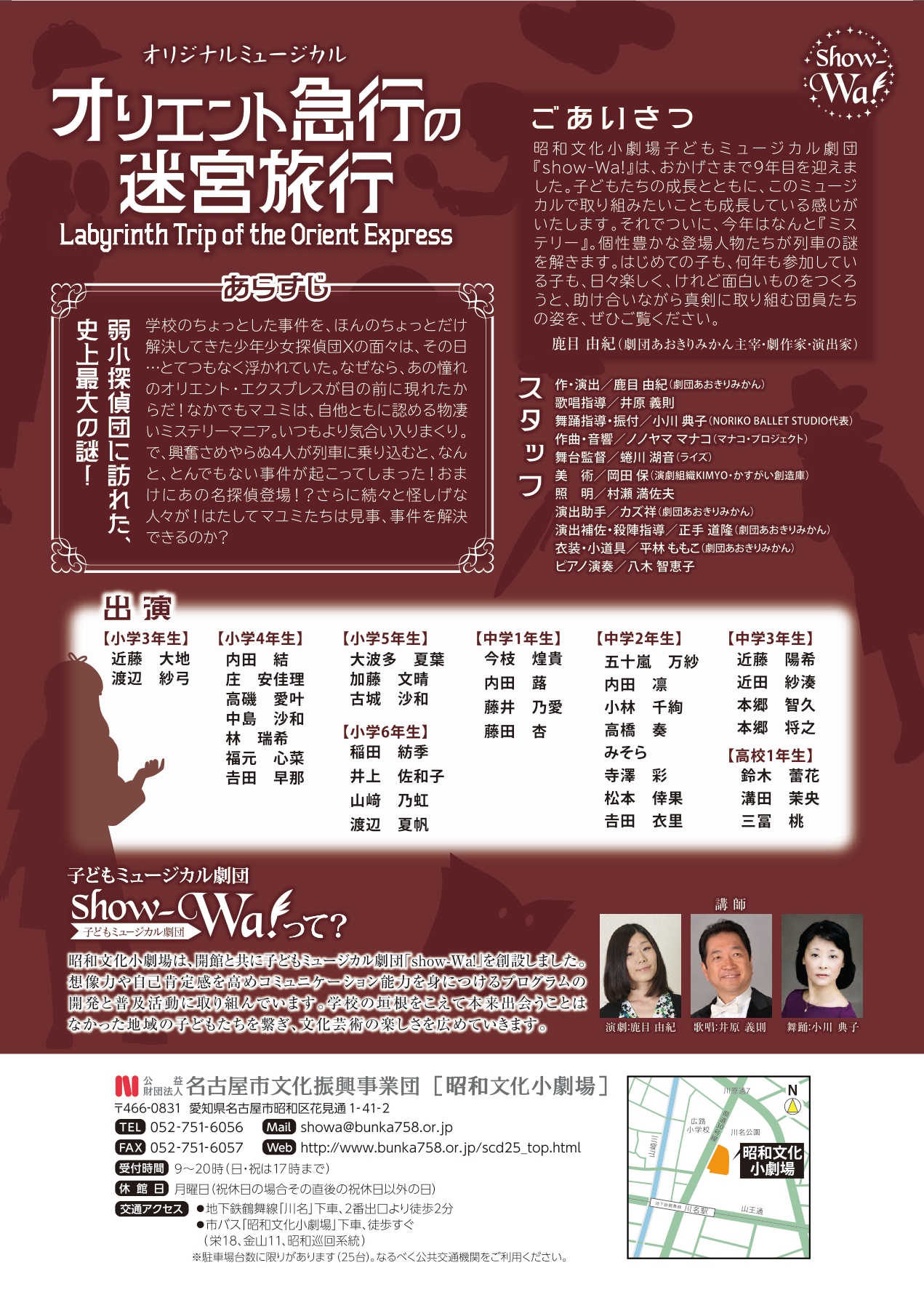 鹿目由紀が脚本・演出をつとめます、子どもミュージカル劇団show-Wa!第9回公演 オリジナルミュージカル『オリエント急行の迷宮旅行』が上演されます。